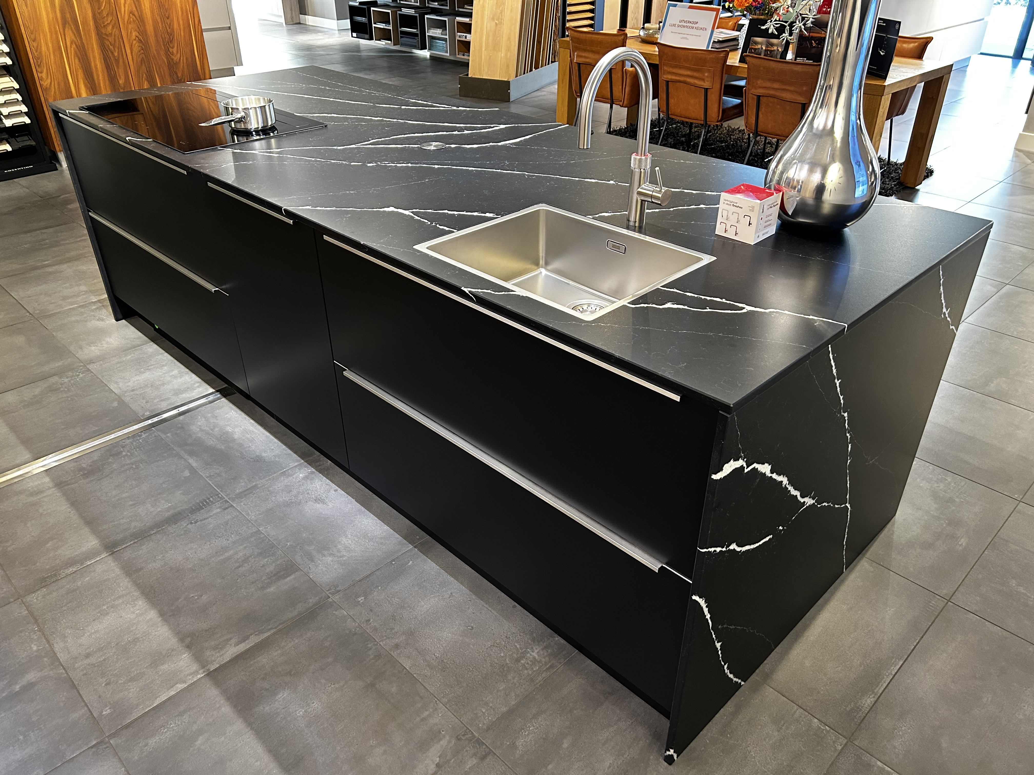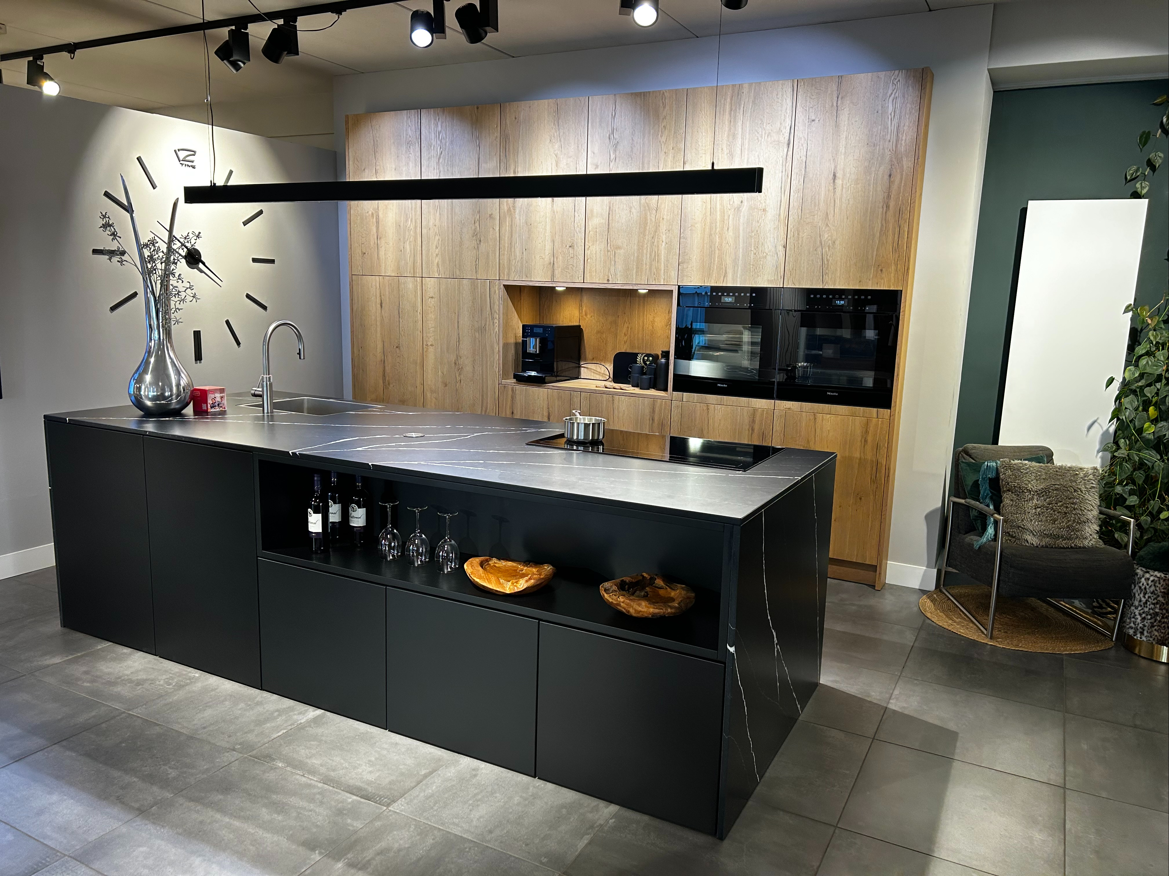 In deze showroomkeuken is het beste van het beste materiaal toegepast. De royale opstelling met eiland biedt volop werk- en opbergruimte en vormt een echte blikvanger in elke moderne leefruimte. De kastenwand is uitgevoerd in een stijlvolle kunsthoutrepro. Het eiland is uitgevoerd in een mat doorgelakt zwart front. Het composieten werkblad loopt elegant door in de stolwanden van het eiland, wat zorgt voor een enorm luxe uitstraling.