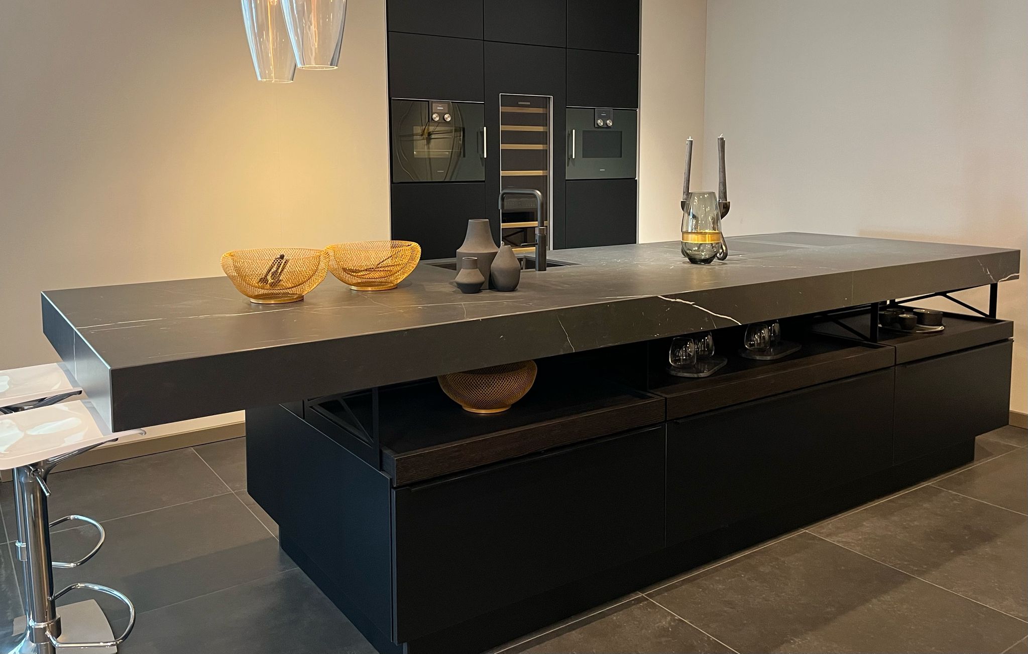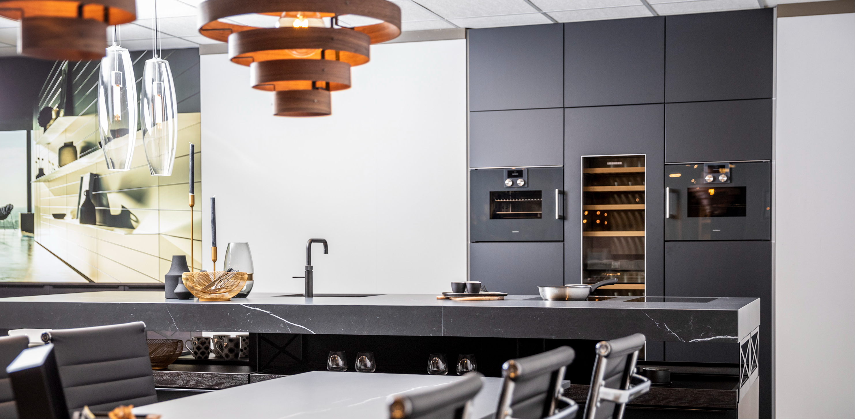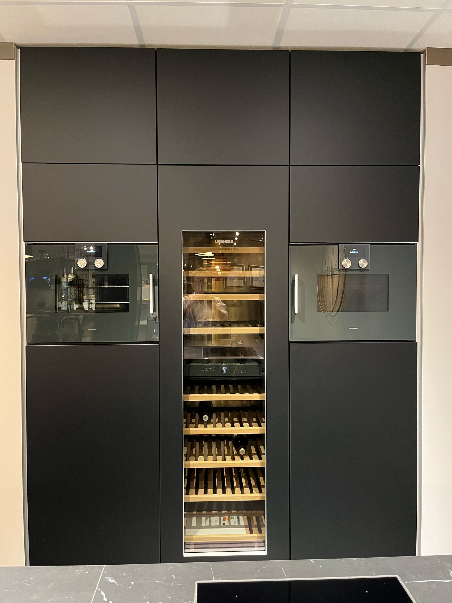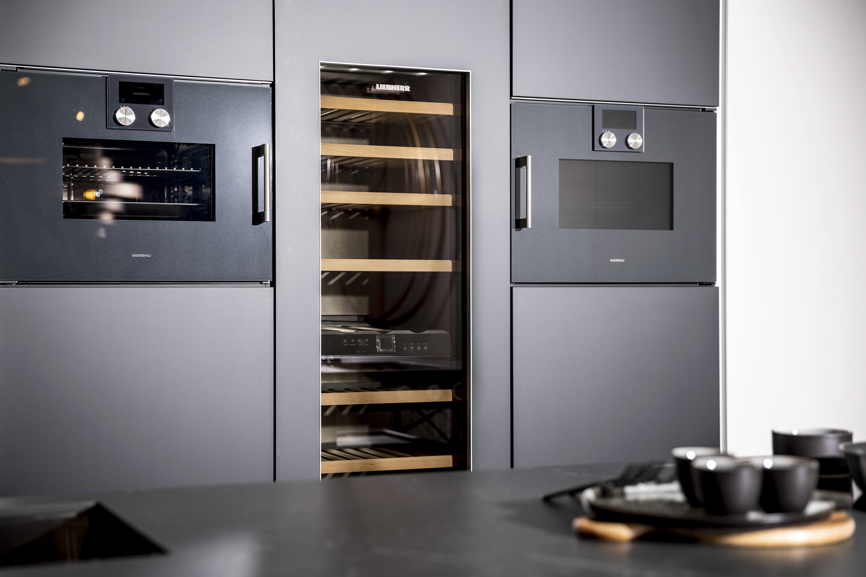 Een echte eyecatcher voor wie houdt van strak design en topkwaliteit. Een apparatenwand voorzien van high-end inbouwapparatuur zoals een combi-oven, wijnklimaatkast en combi-stoomoven van topmerken zoals Liebherr en Gaggenau.
