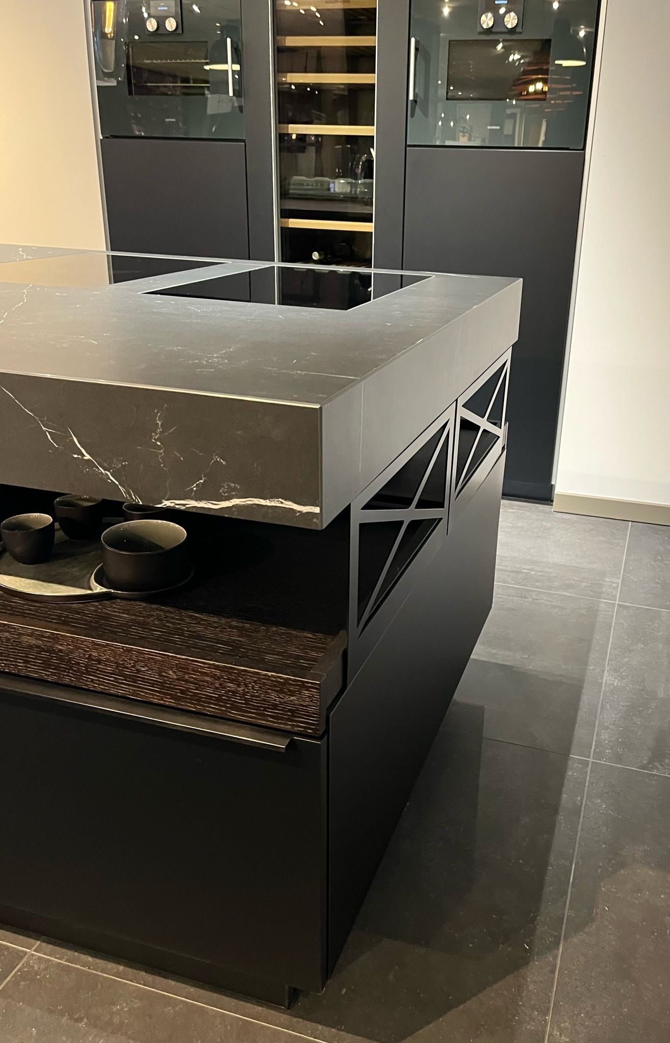 Ervaar de ultieme combinatie van verfijnd design, functionaliteit en topkwaliteit met deze exclusieve Poggenpohl showroomkeuken. Deze keuken straalt pure elegantie uit dankzij het greeploze, matzwarte front met subtiele details en een robuust werkblad.