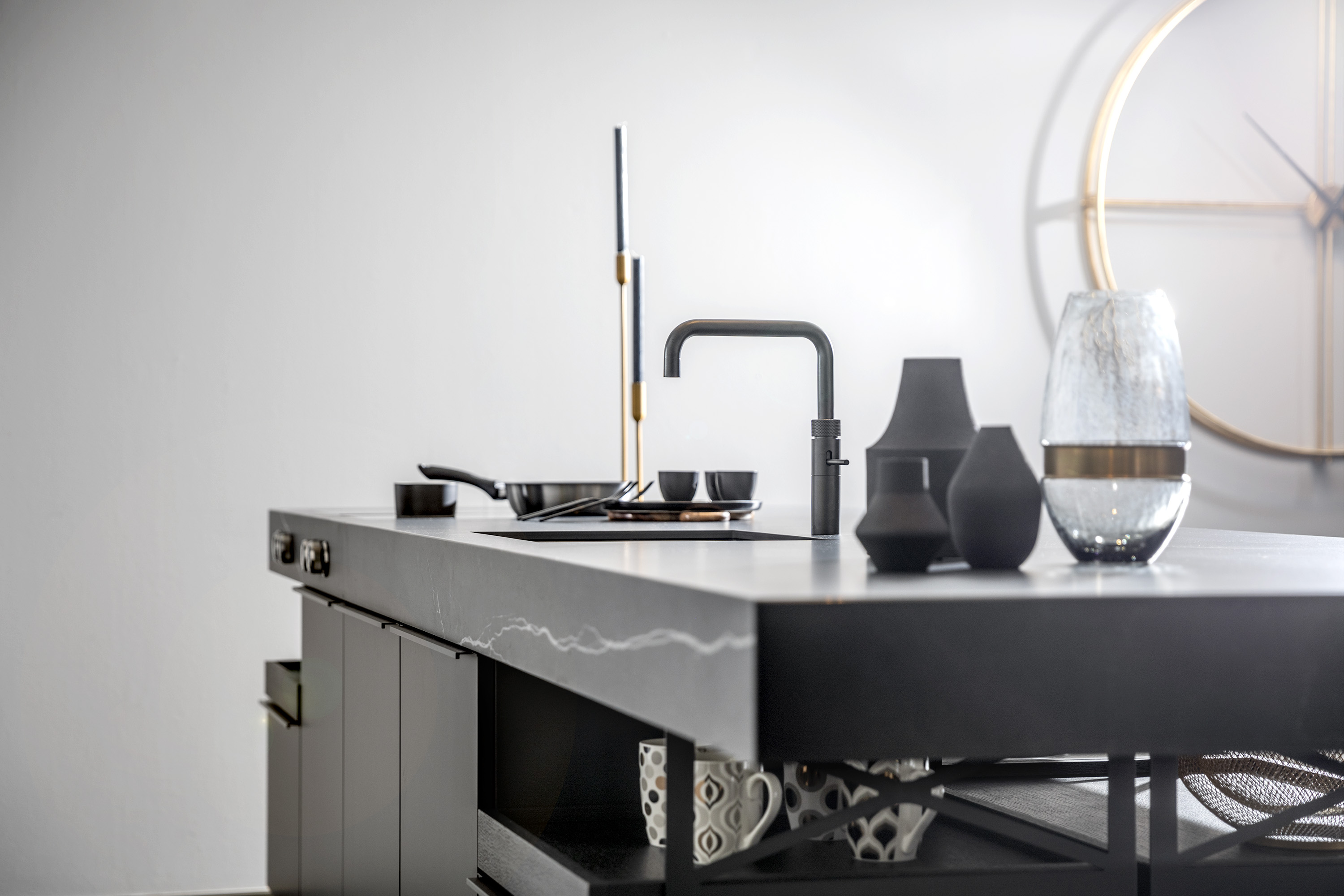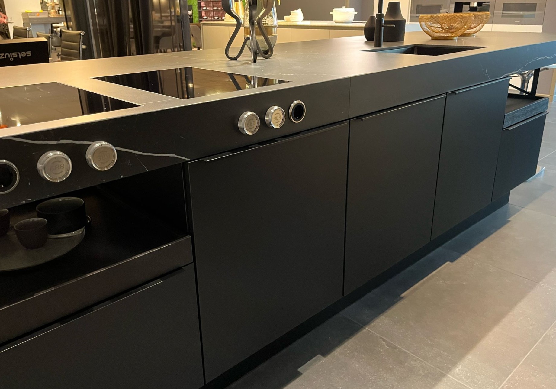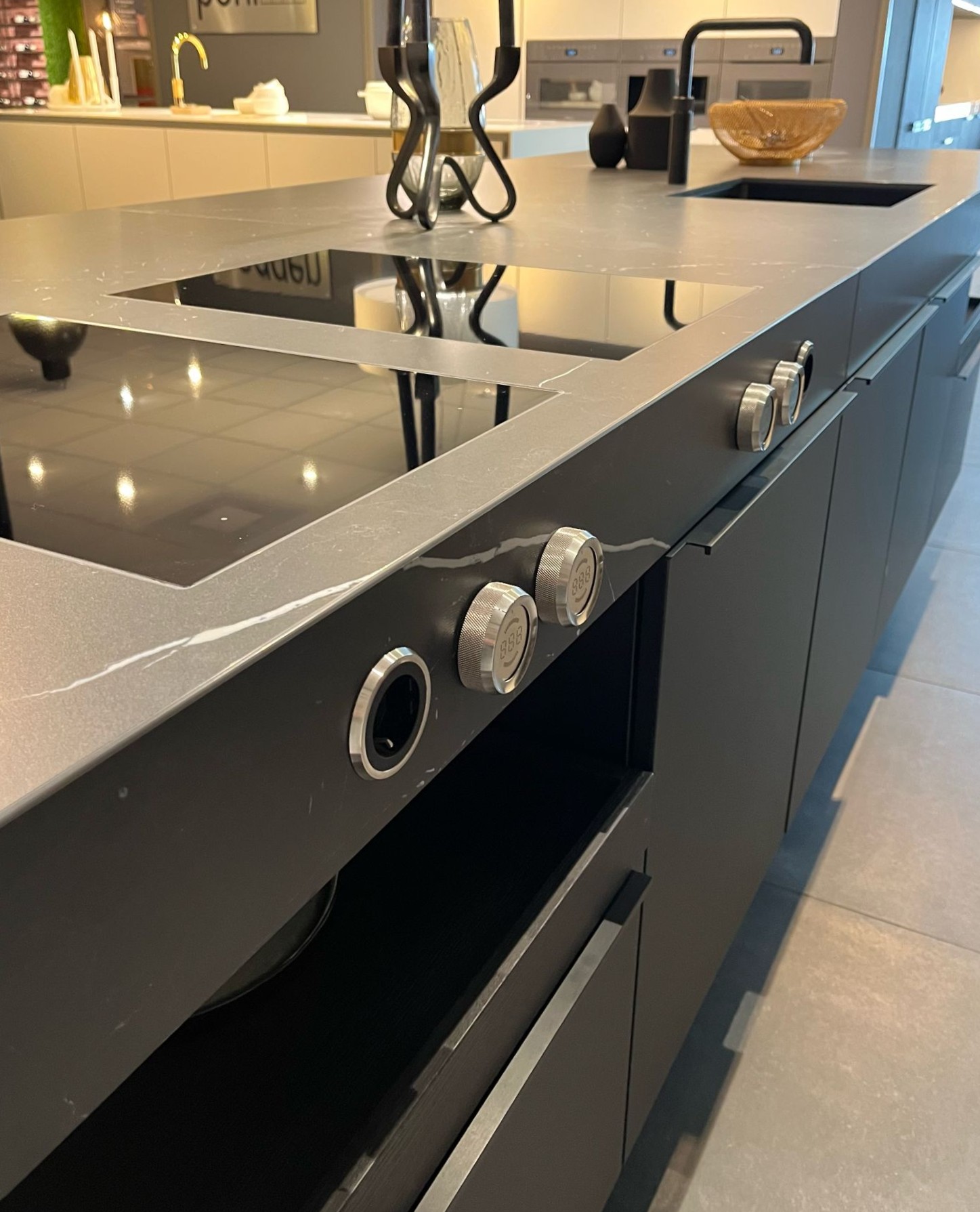 Een ruim kookeiland met geïntegreerde kookplaat en bedieningsknoppen aan de zijkant, modern weggewerkt in het werkblad.