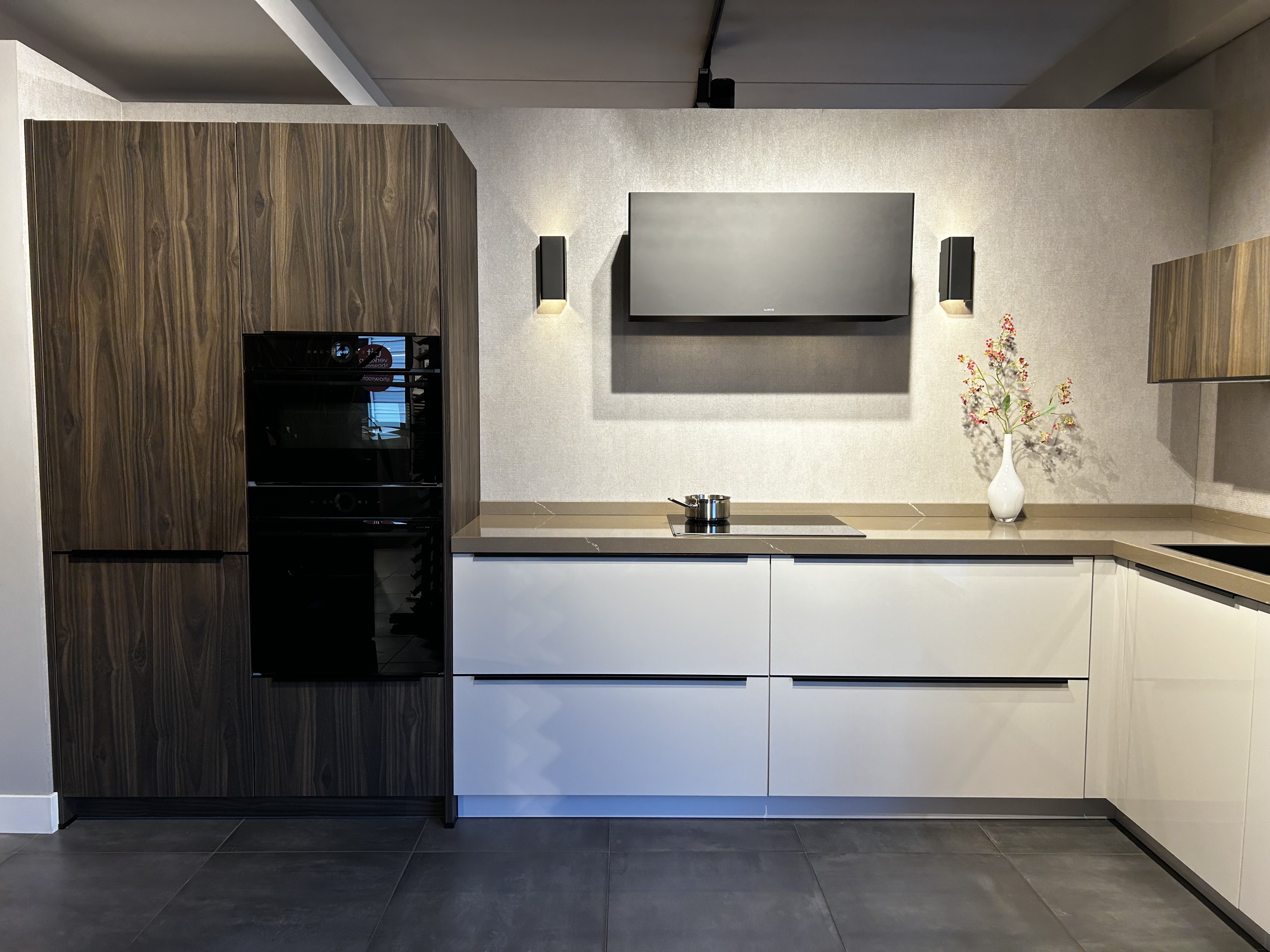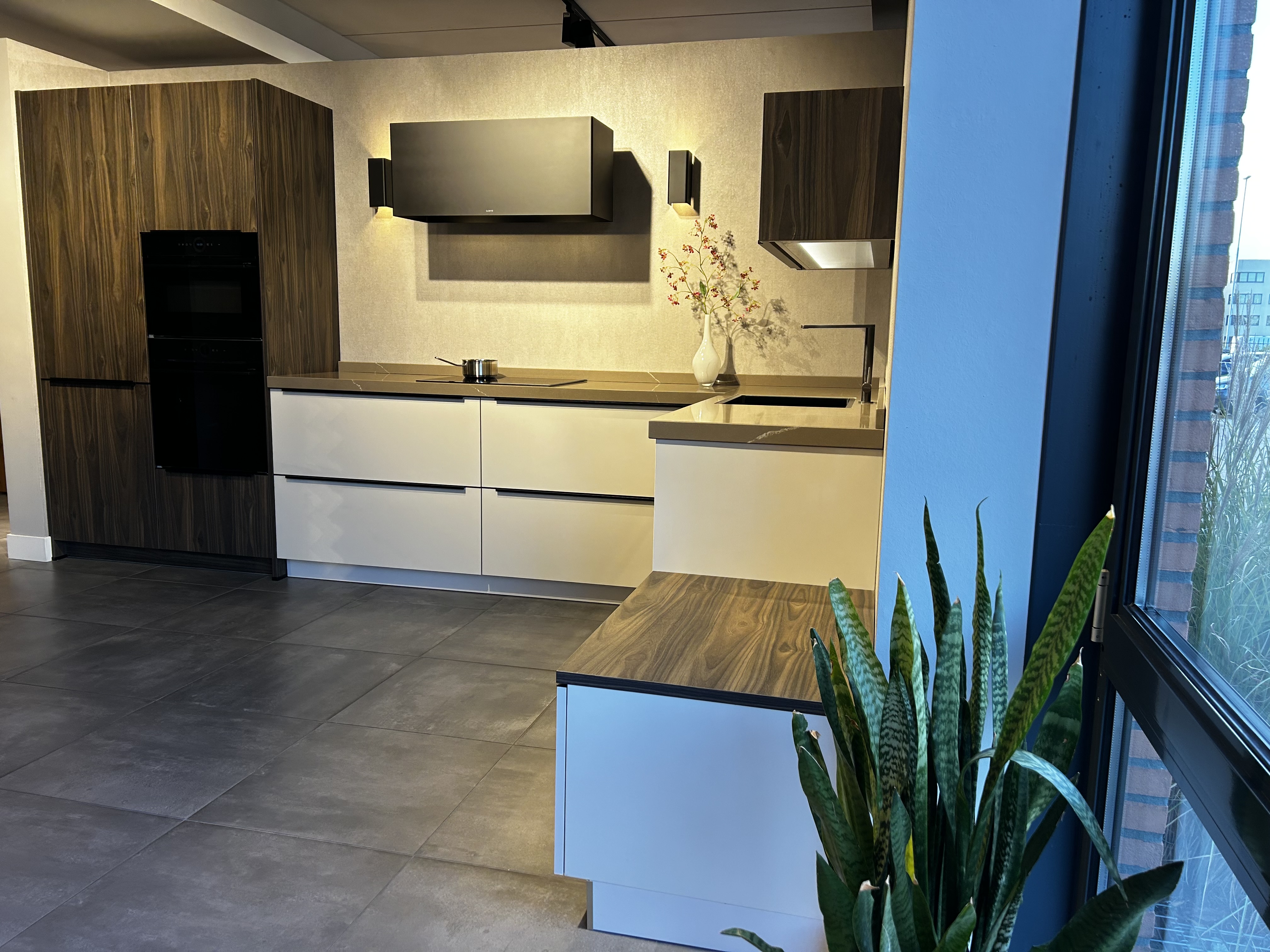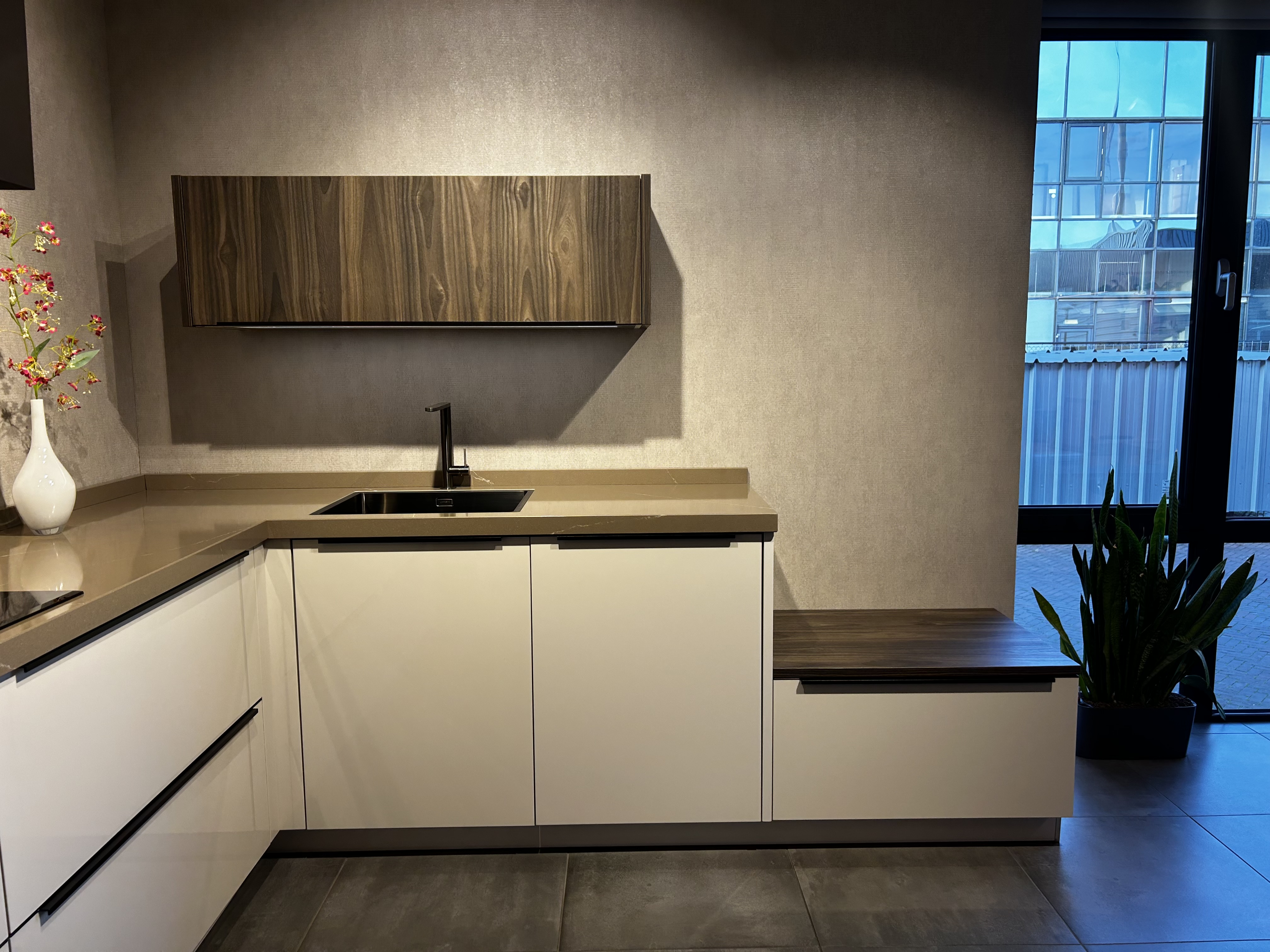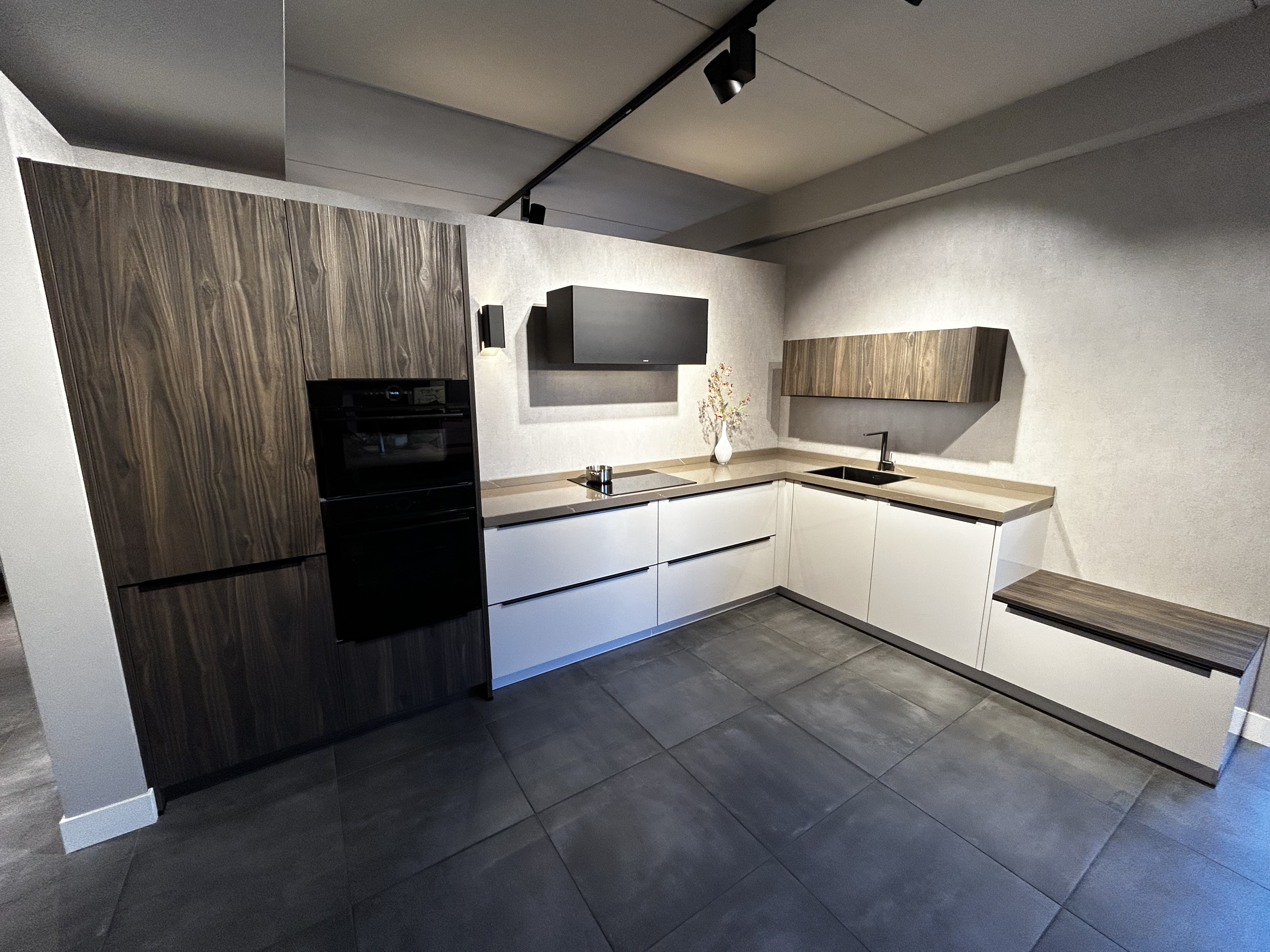 In deze showroomkeuken is een praktische hoekkeuken gecreëerd. De ruimte in deze keuken is optimaal benut zonder dat deze keuken volgezet is met bovenkasten, waardoor deze alsnog een open uitstraling heeft. De keuken is uitgevoerd in houtrepro hoge- en bovenkasten, gecombineerd met hoogglans gelakte onderkasten in de kleur satijn. In de keuken is Bosch apparatuur gebruikt met de reguliere bakoven, de combioven, de inductiekookplaat, de geïntegreerde vaatwasser en de koelkast. Voor de afzuigkap is gebruik gemaakt van een Wave designkap welke door het mooie design nauwelijks opvalt. In de keuken is gebruik gemaakt van een composiet aanrechtblad in de kleur noblesse sand.
