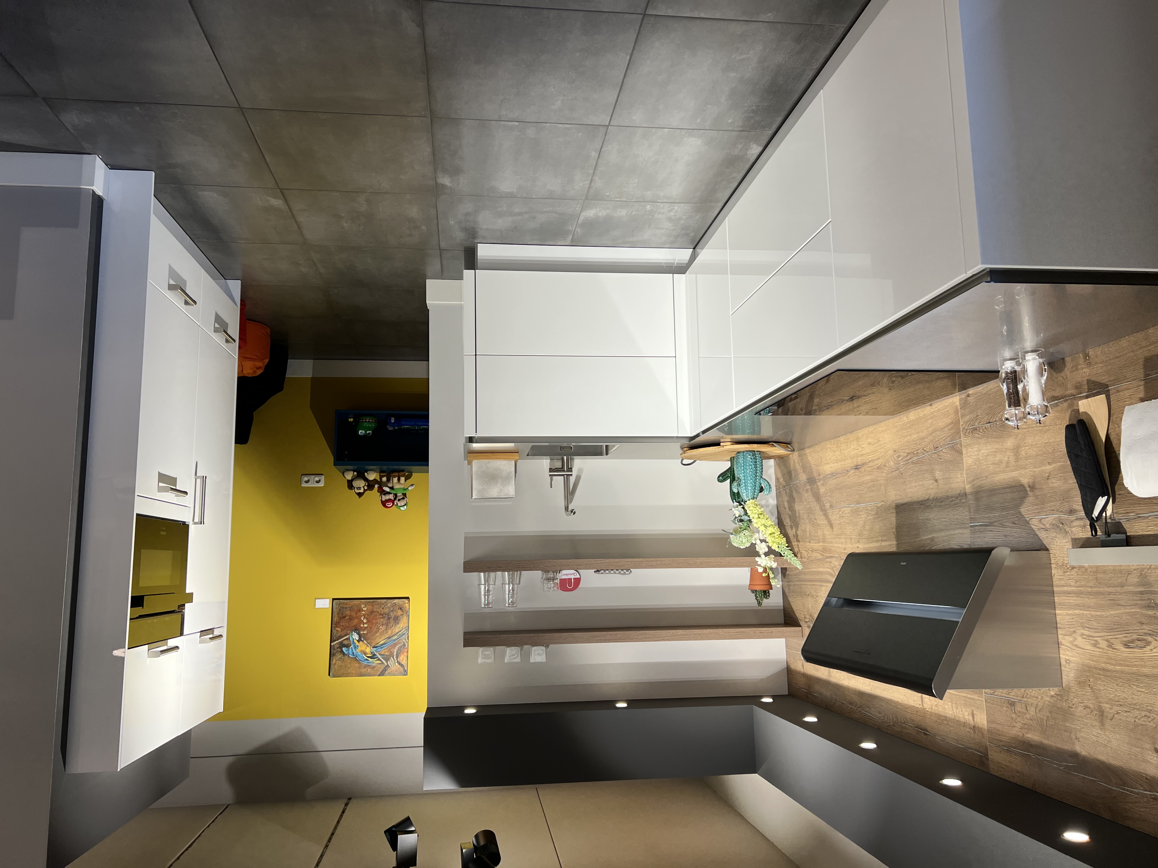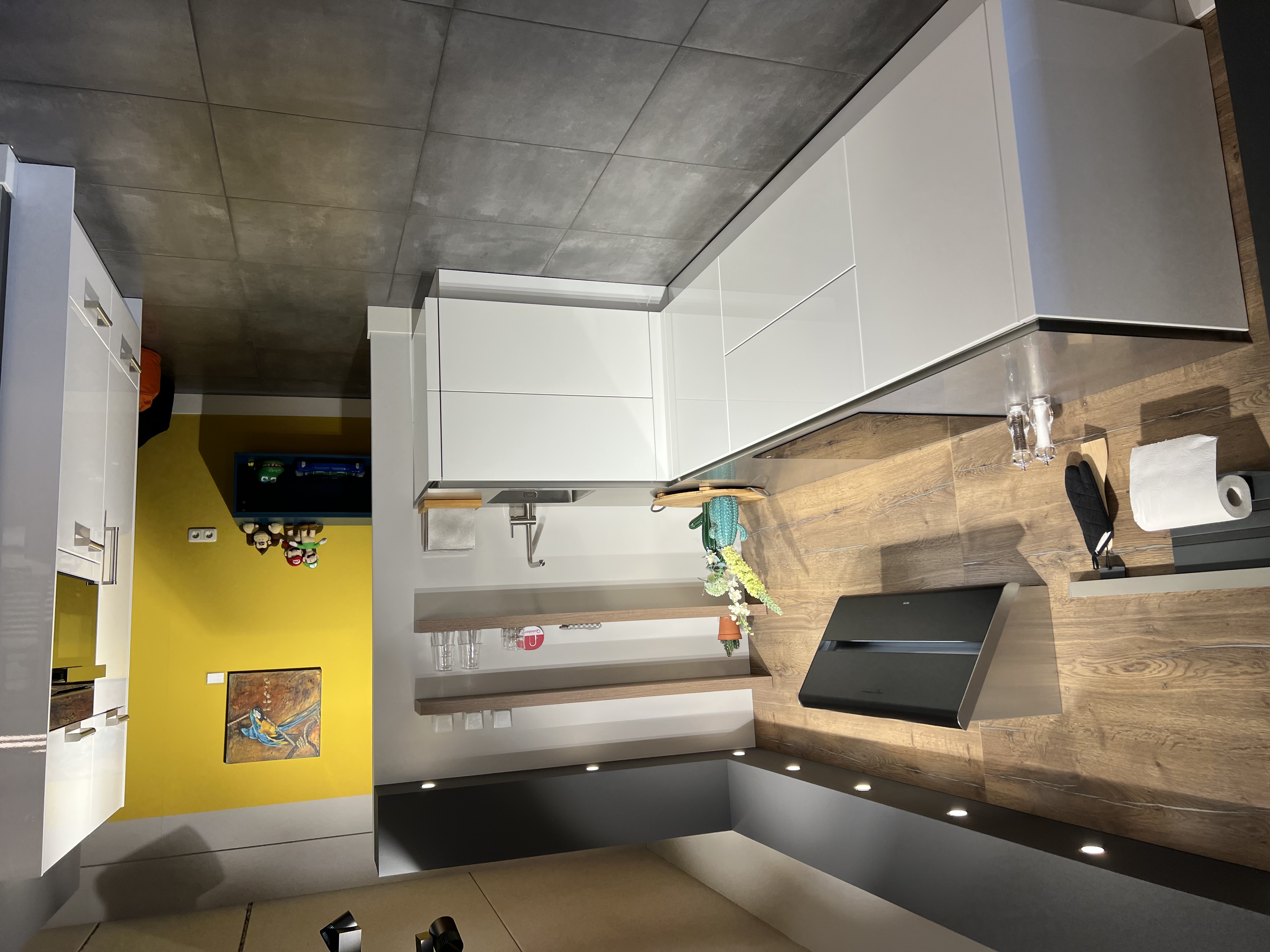 In deze showroomkeuken is ergonomie perfect gecombineerd met esthetiek. Doordat in deze keuken alle inbouwapparaten op hoogte zijn gebracht, kunnen deze allemaal gebruikt worden zonder dat je hoeft te bukken. De keuken is uitgerust in een hoogglans doorgelakt front in de kleur wit en is voorzien van een massief roestvrijstaal aanrechtblad. De onderkasten zijn greeploos uitgevoerd en de hoge kasten zijn met greep uitgevoerd om een optimaal lijnenspel in de hoge kasten te kunnen krijgen. In deze keuken is gebruik gemaakt van luxe Siemens inbouwapparatuur met de geïntegreerde vaatwasser, de koelkast, de combioven en de inductiekookplaat. De afzuigkap is in deze keuken een diagonale schouwkap van het merk Berbel . De keuken is luxe afgewerkt door de mooie achterwand en regaalplanken in een houtrepro materiaal.