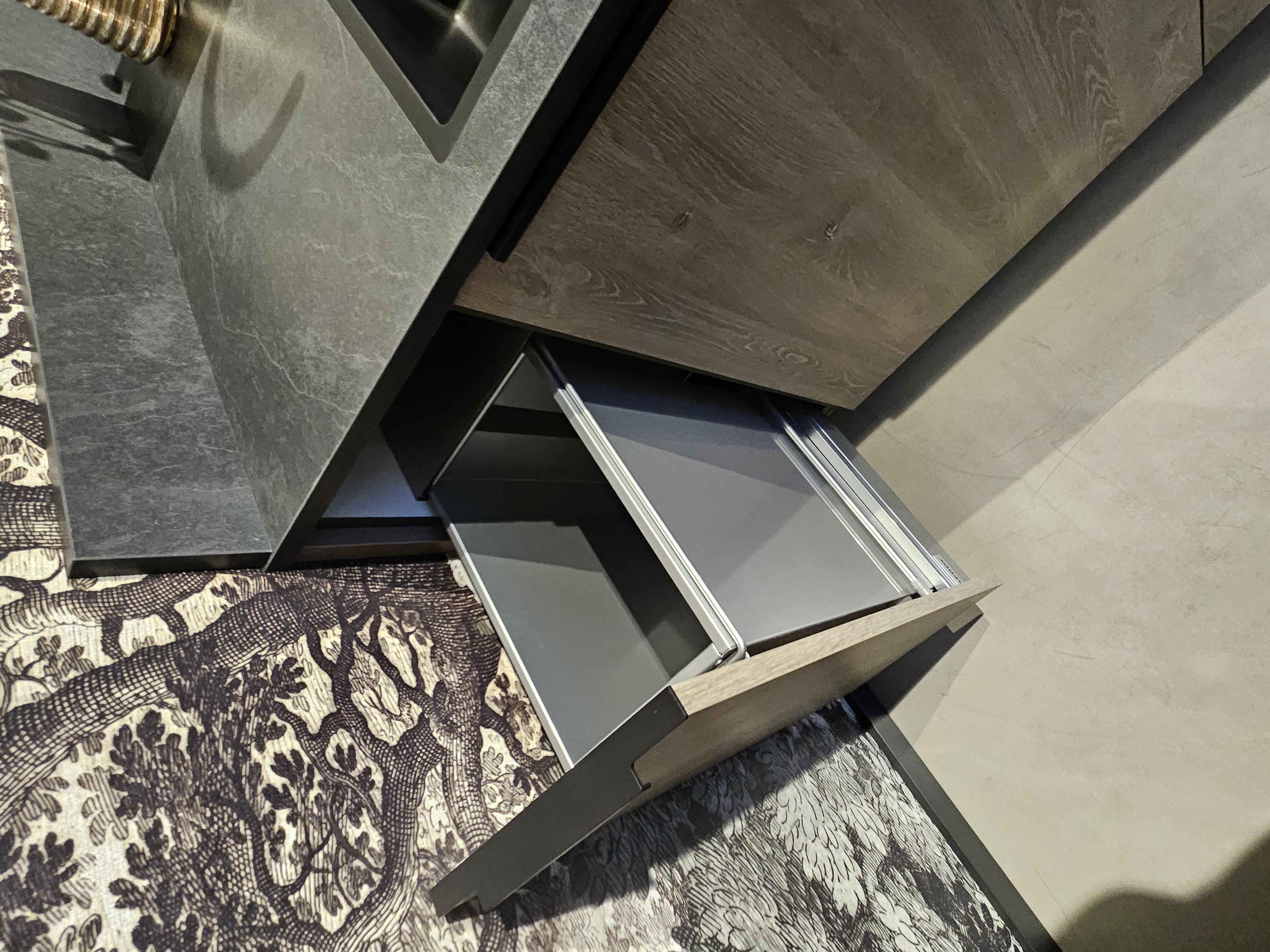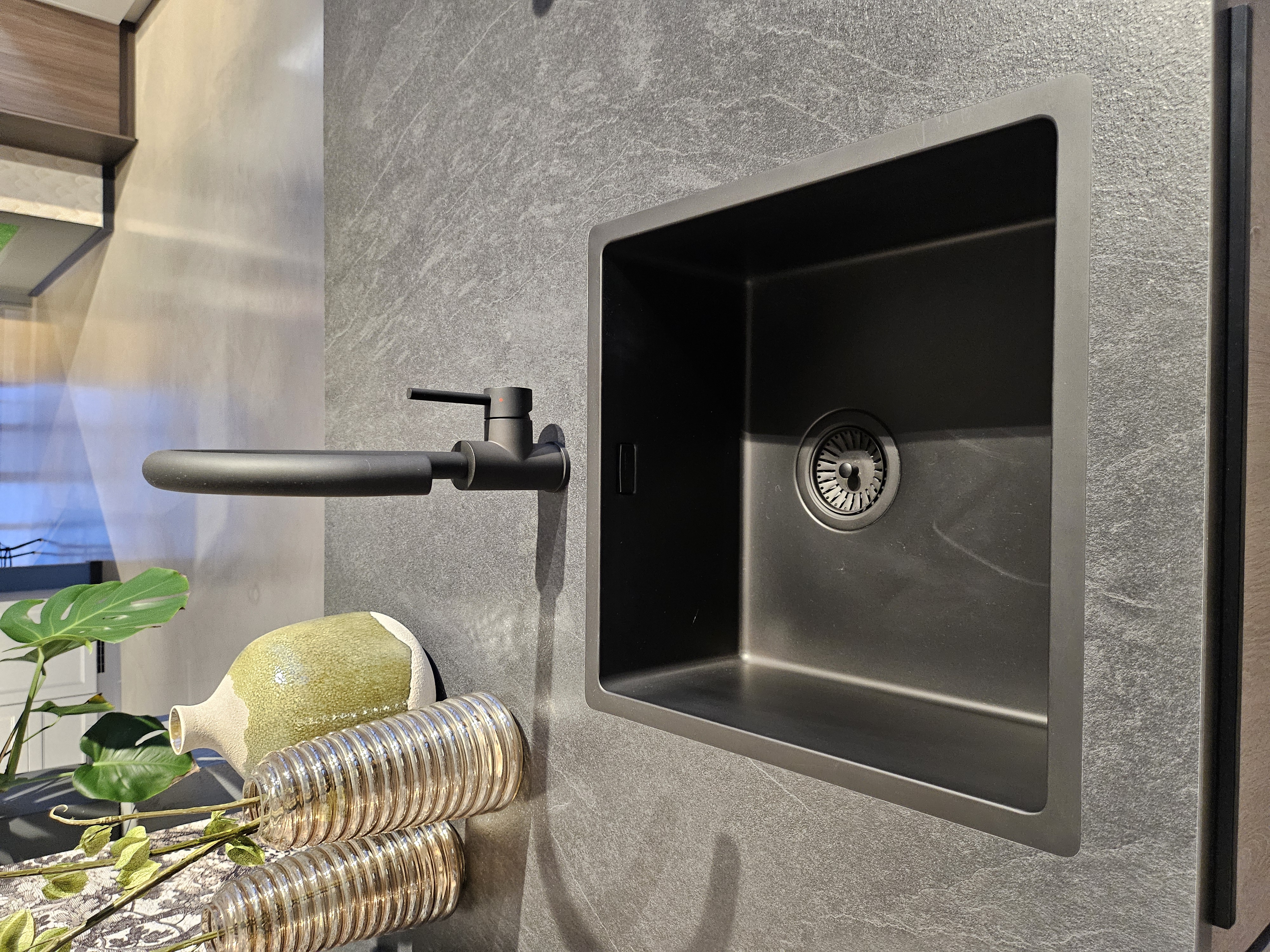 Eiland met zwarte spoelbak en kraan en ene kookplaat met geintegreerde afzuiging. Verder een oven met pyrolise en een combi met opberglade eronder.
