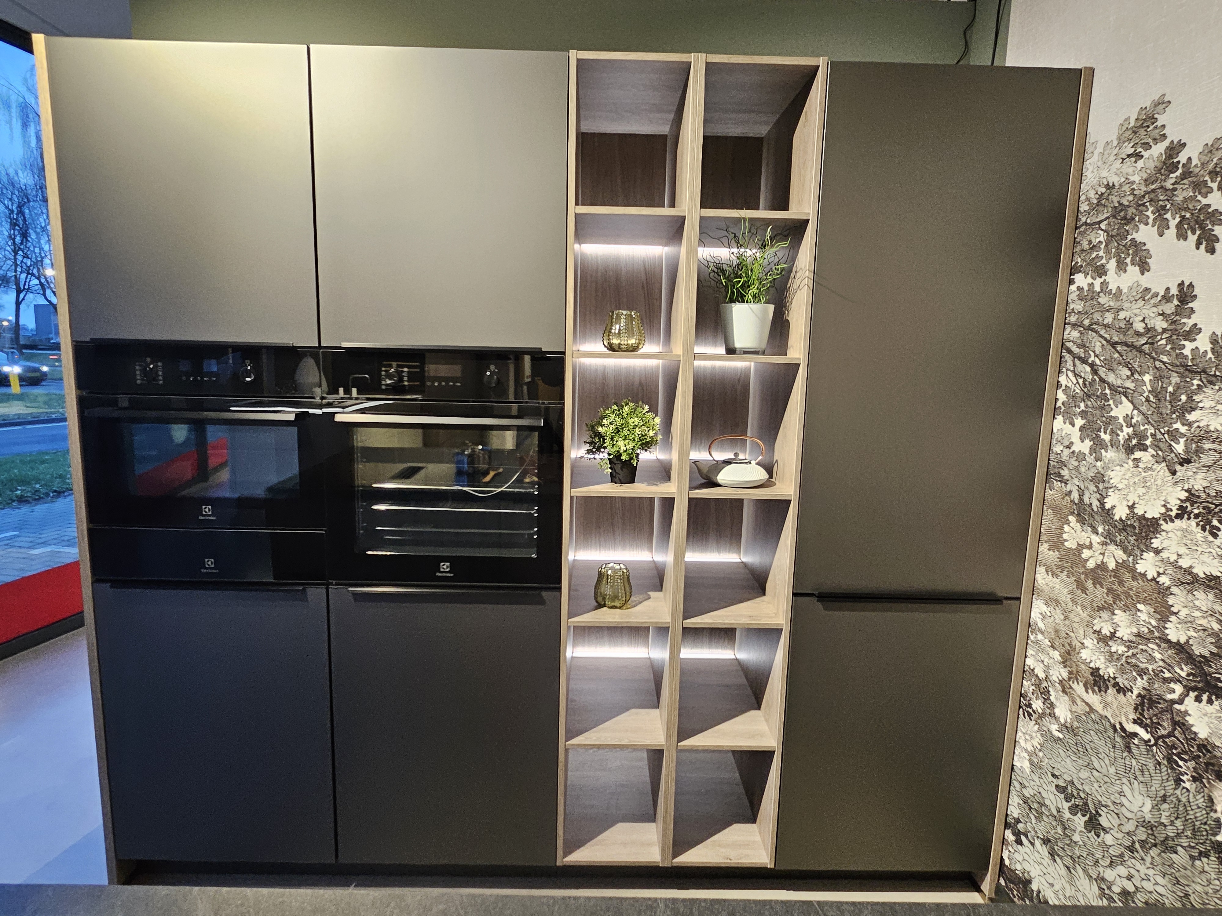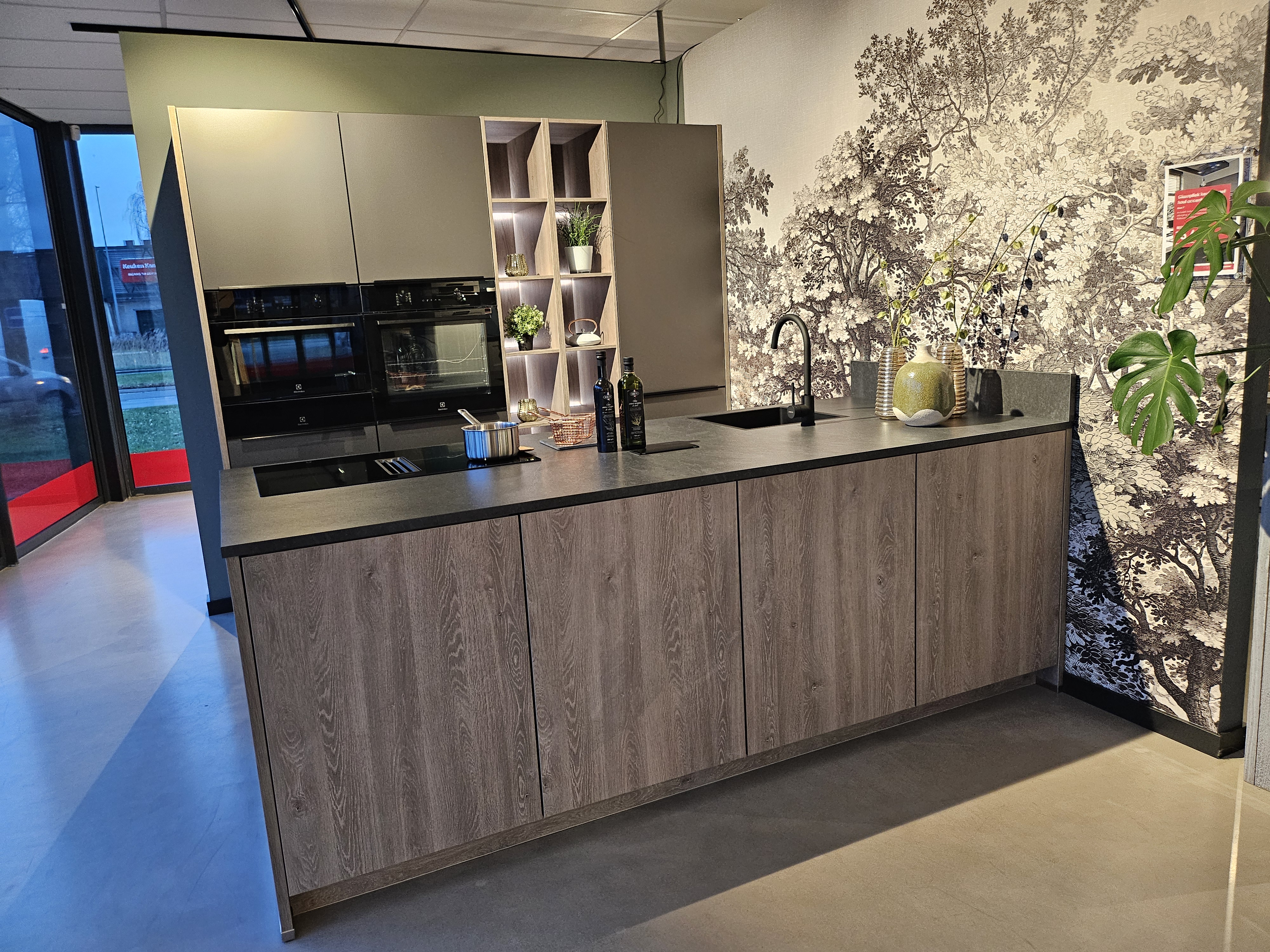 Deze moderne keuken is uitgevoerd in een combinatie van 2 kleuren. Houtoptiek eiken Bergamo gecombineerd met Glasoptiek Titanio. Een chique combinatie. Zeer fraai detail zijn de 2 hoge open kasten met verlichting.