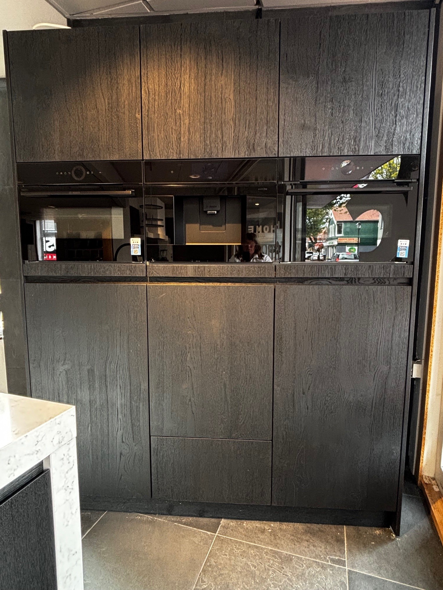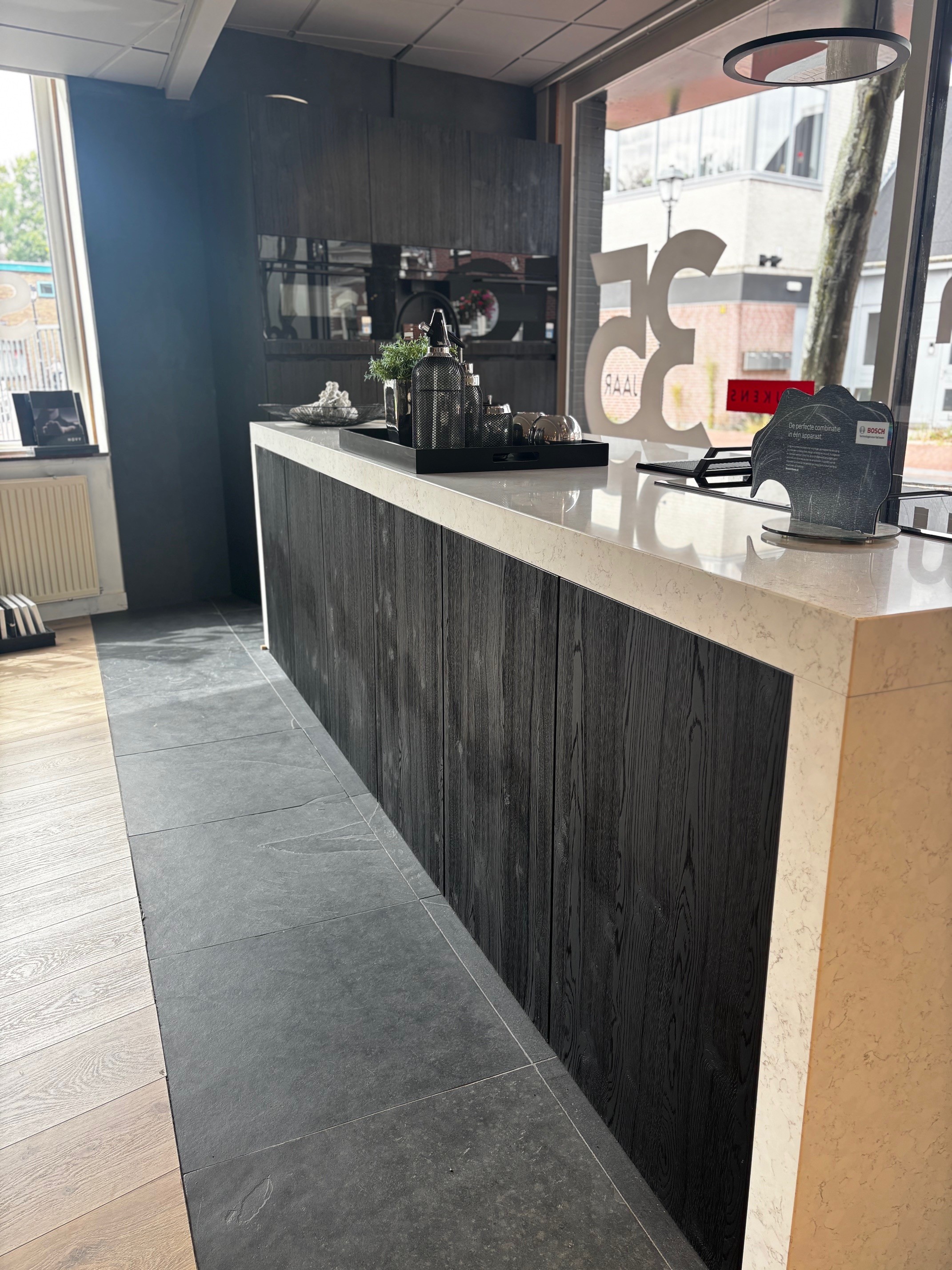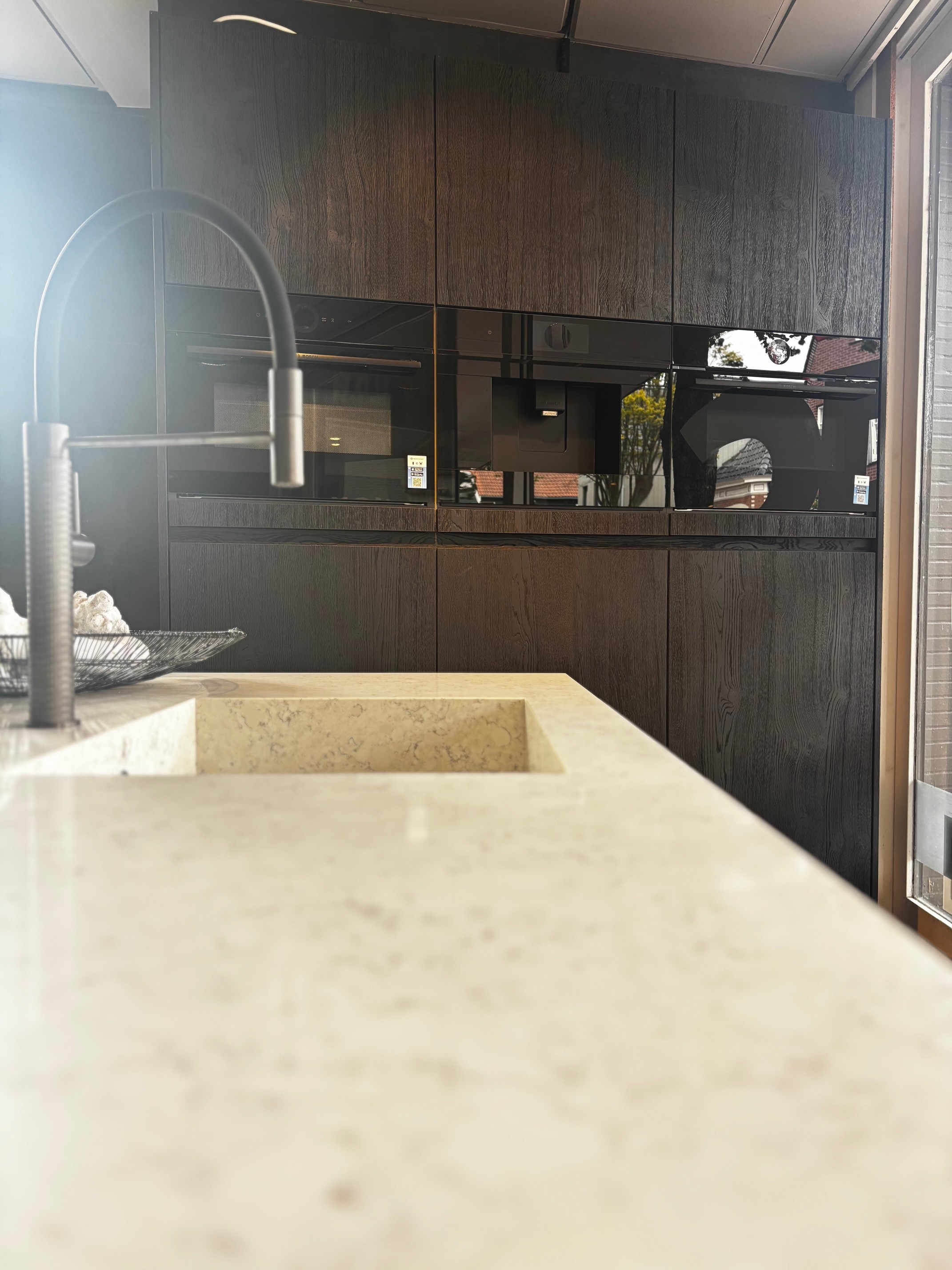I.v.m. de verbouwing van onze showroom bieden wij deze exclusieve showroomkeuken van Beda aan, type Boston Listo Greeploos met Eiken fineer rustiek genoeste 45° fronten. Een keuken van topkwaliteit met een warme uitstraling en luxe afwerking.