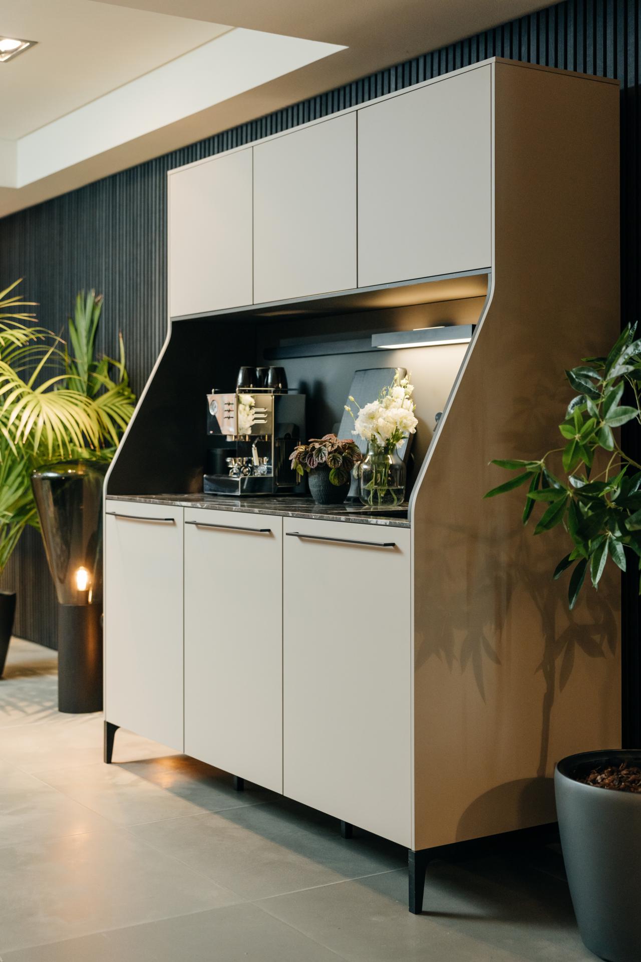 De beige pantry op de foto is ter inspiratie als koffiecorner, het betreft de zwart eiken pantry.
