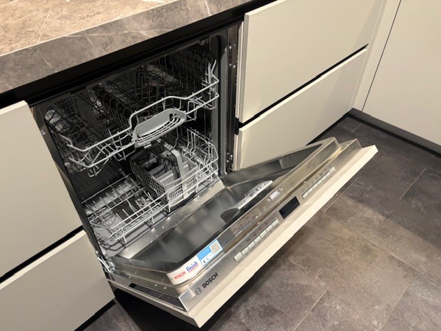 Zandkleurige greeploze hoekkeuken voorzien van luxe Bosch apparaten